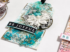 For the "Be Joyful" tag I used the Starry Night stencil to add some stars using Ranger's crackle paste, then I added Karin's Dream embossing Powder to give a distressed golden shine to the stars. Once dried I dusted some Lindy's Guten Tag Teal powder and sprayed water to get that teal colored background. Using Archival black ink I added some script with a small stamp in random places on the tag, colored and embossed the flourish background diecut with the same 2 colors used in the tag and glued all embellishments in place. I stamped the Be Joyful sentiment with the WOW! Embossing Pad, and heat embossed Bonding Powder so that I could use the Snowy White Fab Foil for the sentiment. I used a piece of WOW's Superior Smooth White Cardstock cut slightly bigger than the size of the cardstock used for the sentiment and again used the teal powder with water to get the same color as background and glued the sentiment onto it. Added the sentiment to it and glued the sentiment onto the tag. Then I added some mini art stones using Ranger's Multi Medium Matte.